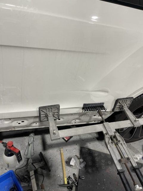 近年、特に輸入車はボディパネルにアルミ素材が使われる事が多くなってきておりますが、弊社ではアルミパネルに対応した設備を導入しておりますので、このように大きく潰れていても修復する事が可能です。